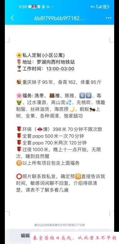 在福田区有自己的工作室,身材无敌,长相也不错,不过服务只有打飞机,冲着服务就算了,冲身材可以去